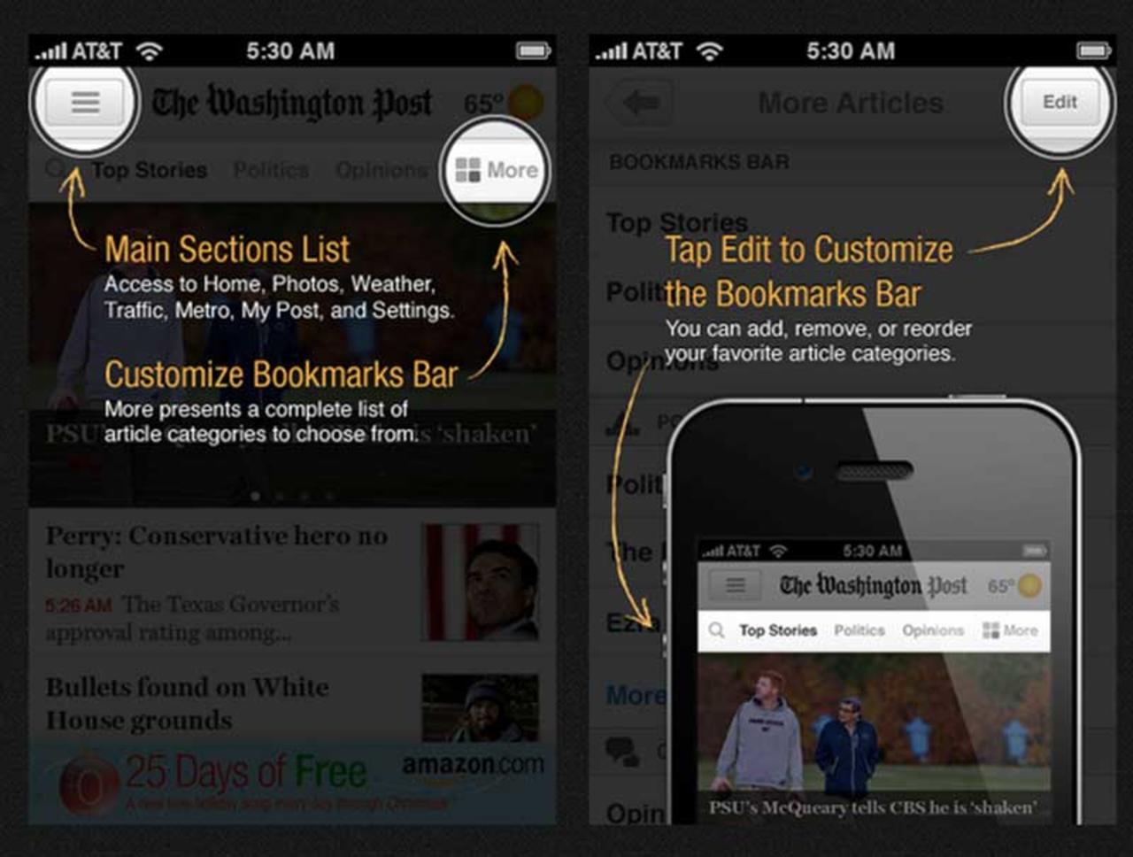 - Utilizing badge counts or "bouncing" animations to indicate some action that needs to be performed. The benefit is that the user can try it on their own time, and you're not rushing them. The downside, though, is that some users may never actually click.